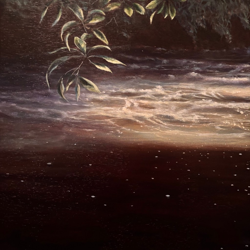 With this painting, I noticed how important the right lighting is. When I painted it in my studio, it looked warm and balanced, with the greens not too overpowering and the water clean. Unfortunately, when I took it outside, I got quite the shock at how cool and blue the colours suddenly appeared, how the reds and browns got lost, and how the greens looked far too strong and fought for attention. The water that appeared so clean in my studio now looked yellowed and stained. The lighting at the OAS unfortunately reveals all of this—but that’s just life. I have seen this happen before, especially with paintings I haven’t taken outside at all to paint—which was pretty much all of last year. So, something to watch out for in the future!