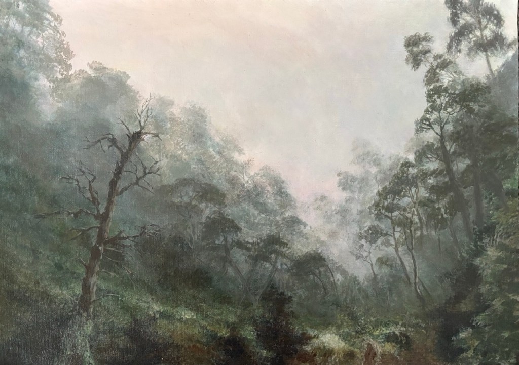 I have now started painting a similar scene on framed meranti plywood, measuring 900 mm x 310 mm. So far it looks quite grey, but the forest in the foreground will soon introduce fresh greens, and I am thinking of leaning the fog towards a pinkish tone, which it already slightly has.