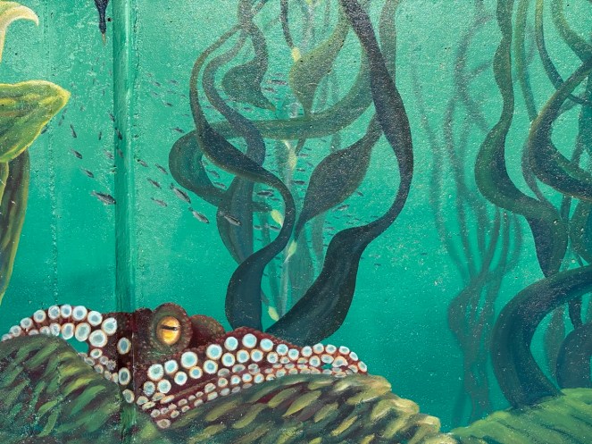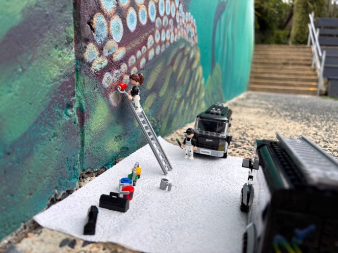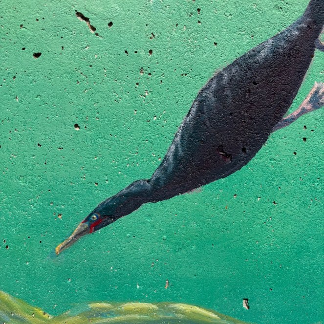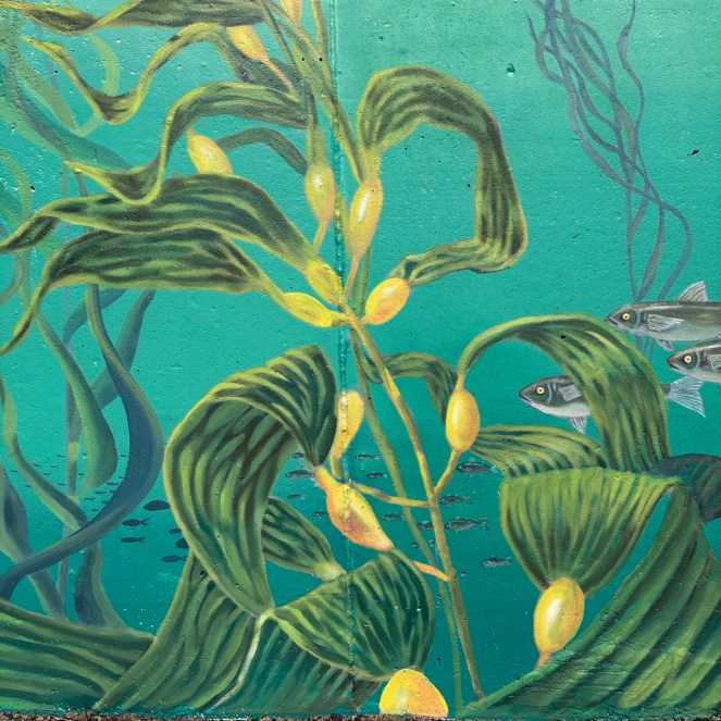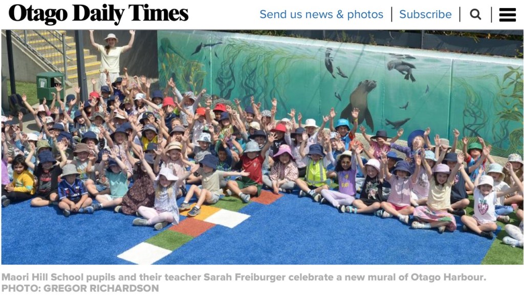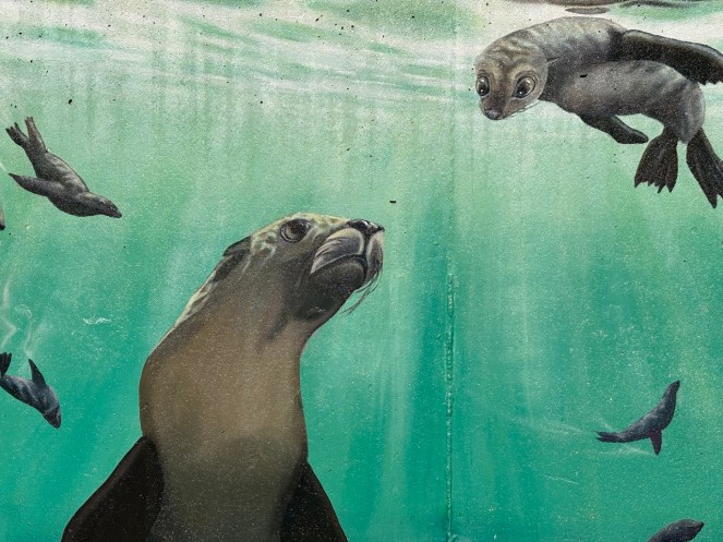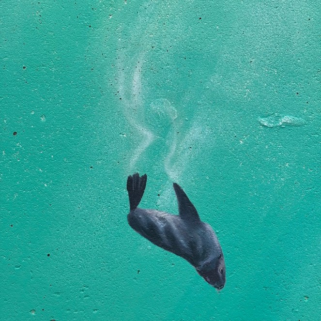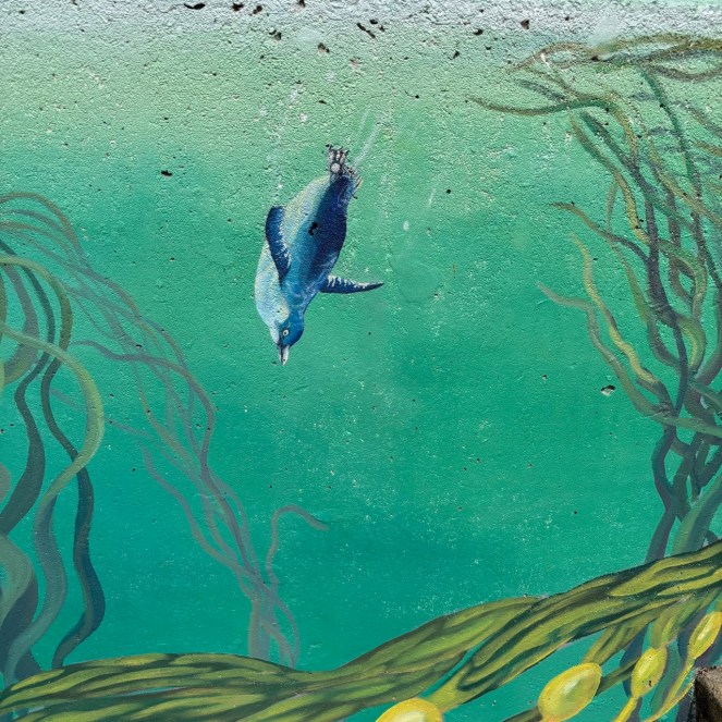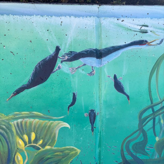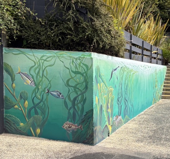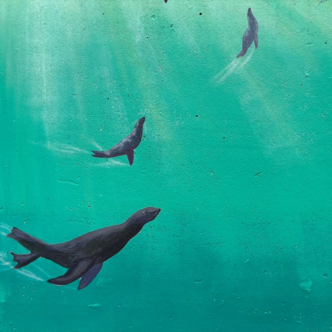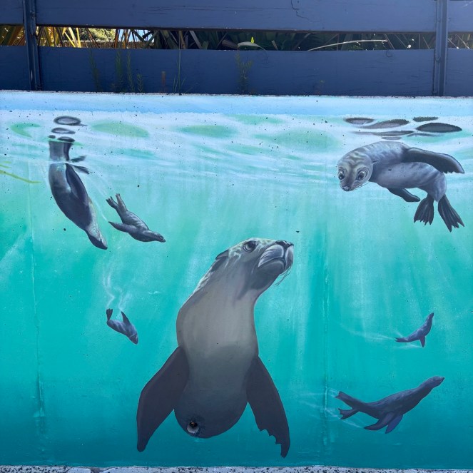 The last step was to paint the centerpiece – a group of Kekeno/NZ Fur Seal diving and socialising. Here are some progress pictures. Photos of the finished mural will be uploaded soon.