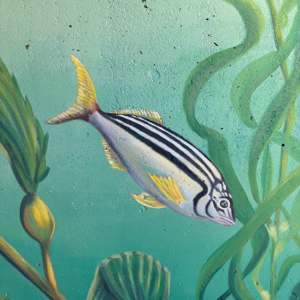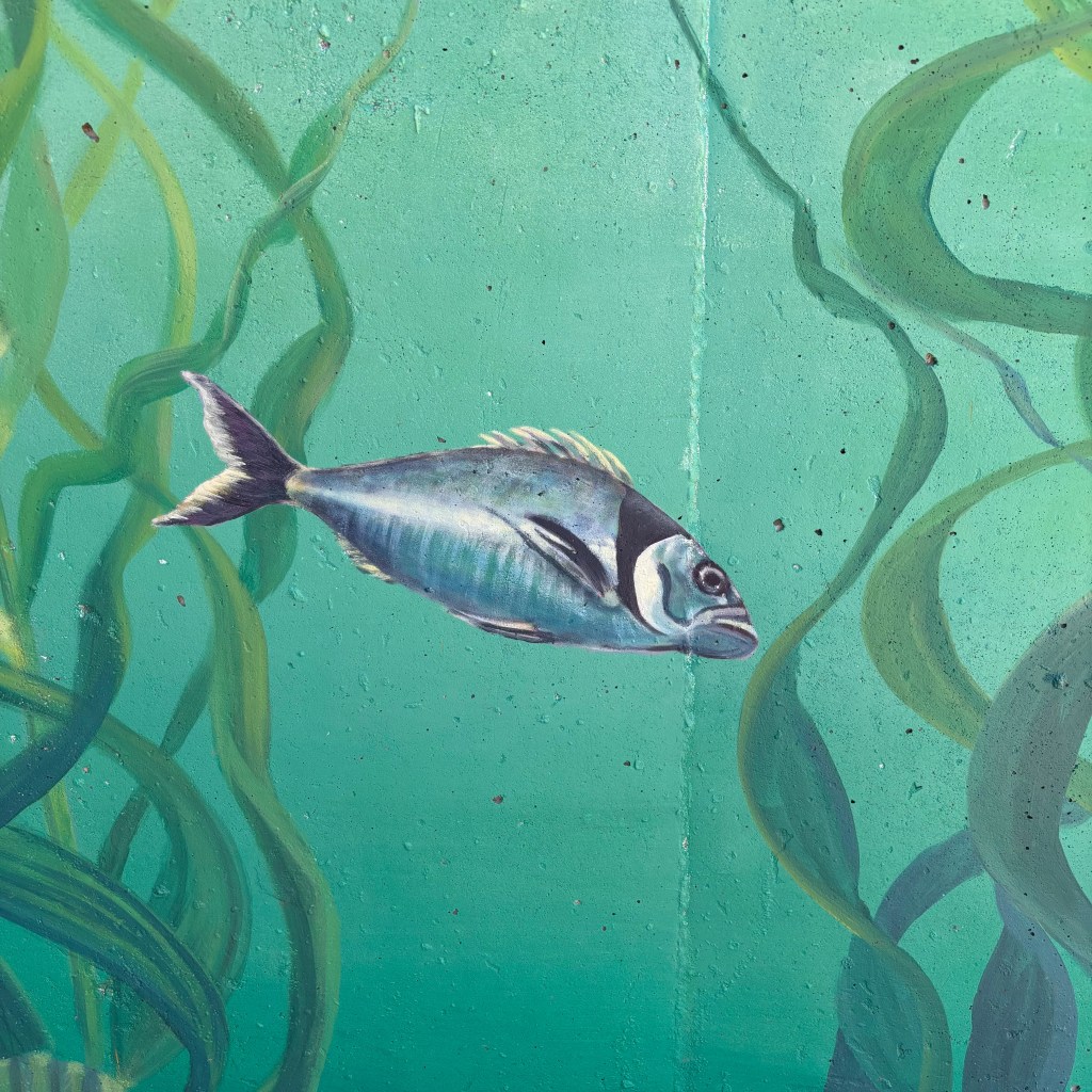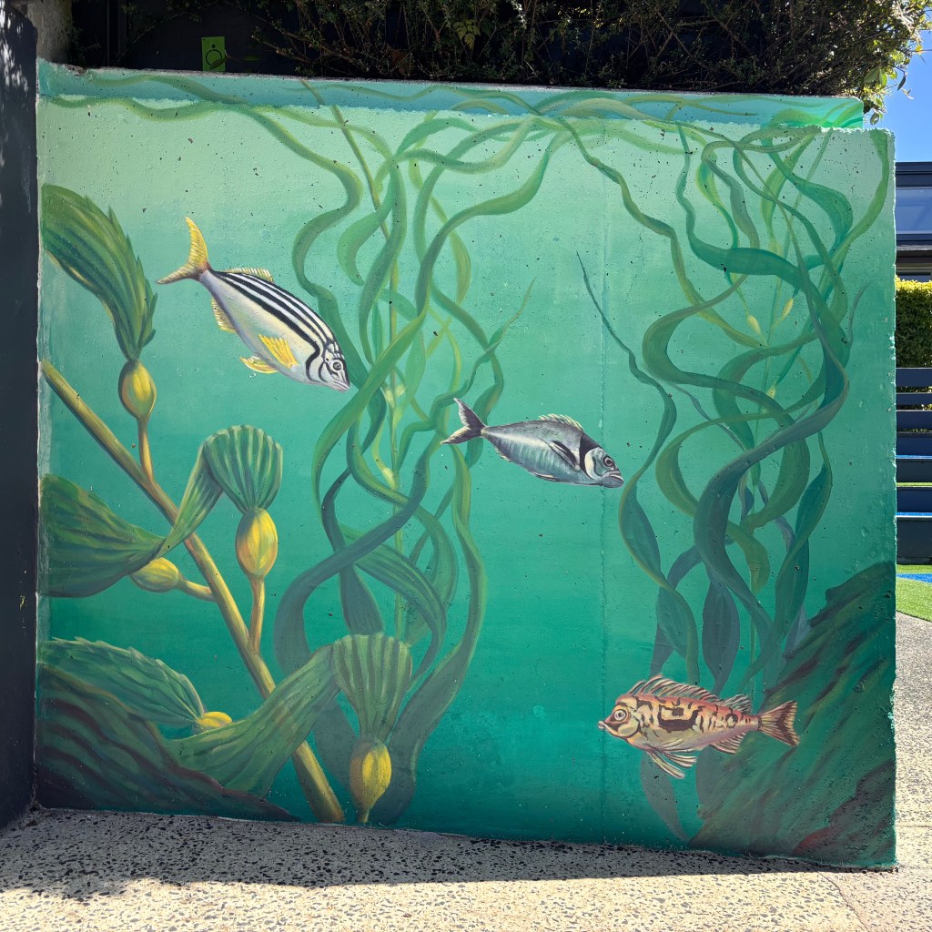 The kelp forest mural is finally completed. The mural wall is situated at the junior play area. It measures about 16 square meters (including the little side wall). I have cleaned the wall, sealed it with Resene Sureseal, transferred my own design onto the wall and painted the mural scene.